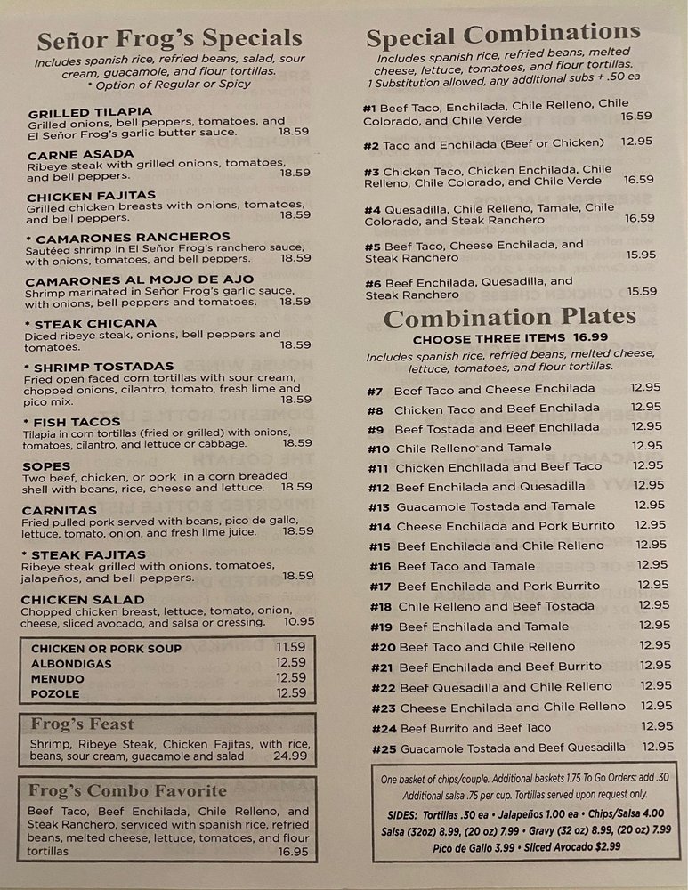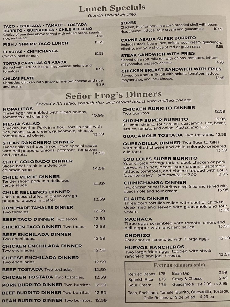 Welcome to El Senor Frog's, where Mexican cuisine shines in Stockton, CA. This family-owned gem offers a variety of delights such as Menudo, Albondigas, and Huevos Rancheros with a green sauce that will leave you craving for more. The flavorful Chicken Enchiladas and Pork Tamales are tender and juicy, satisfying even the most discerning palates. Don't miss out on the Pork & Chicken Flautas or Pork Tamales for an authentic taste of Mexico. The cozy ambience, friendly service, and excellent food make El Senor Frog's a must-visit spot. With indoor and outdoor seating, this restaurant caters to all preferences. Enjoy the warm tortilla chips with fresh salsa and indulge in the Frogs Feast for a delightful mix of shrimp, ribeye, and chicken. Whether you're a local or a visitor, El Senor Frog's promises an unforgettable dining experience.